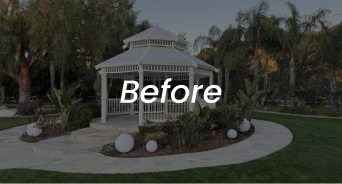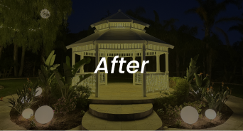 The gazebo was treated as a primary focal structure, using warm architectural lighting to softly illuminate the interior and emphasize its shape and detailing without glare.