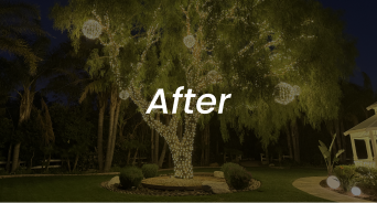 Large existing trees were transformed into statement pieces using wrapped lighting and suspended illuminated spheres, creating depth, texture, and a layered visual effect visible from multiple areas of the property.