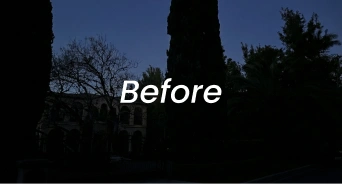 - Dramatic entry presence with illuminated cypress trees