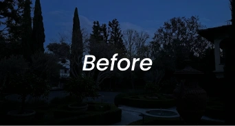 Elevated Seasons was commissioned to design and install a custom low-voltage LED landscape lighting system that would enhance the estate’s arched colonnades, Italian cypress-lined entry, and layered courtyard — without overwhelming the property’s architectural elegance.